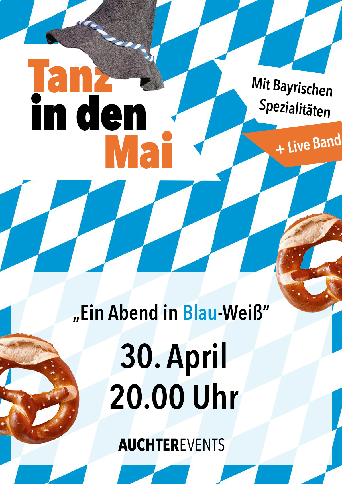 Es wieder soweit ist – am 30.04.2026 findet von 20:00 bis 01:00 Uhr unser alljährlicher Tanz in den Mai in blau weißem, bayrischem Ambiente statt. Wir freuen uns darauf, gemeinsam mit euch eine unvergessliche Nacht zu verbringen, während wir zu den Klängen einer Wiesn Live Band das Tanzbein schwingen.